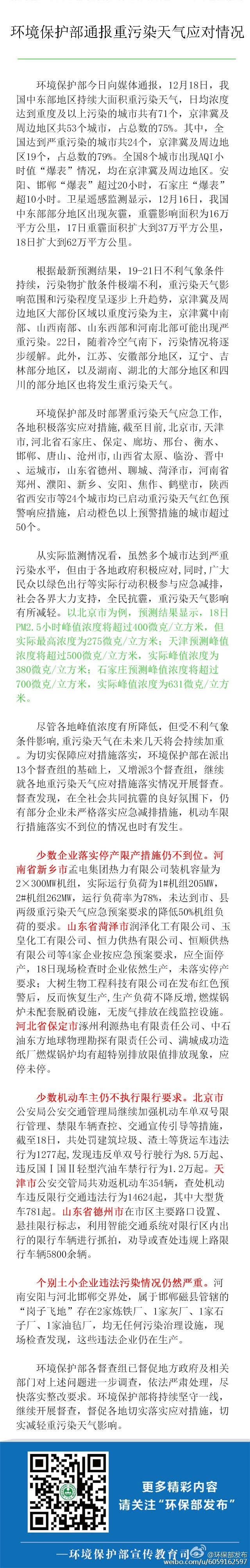 据环境保护部宣传教育司官方微博消息,环保部今日向媒体通报,12月18日,中国中东部地区持续大面积重污染天气,日均浓度达到重度及以上污染的城市共有71个,京津冀及周边城市地区共53个城市,占总数的75%。