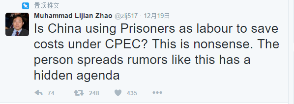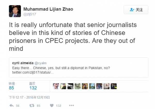 “中国外交官反击对中巴经济走廊的批评”,据巴基斯坦《黎明报》和印度电视台等20日报道,针对巴基斯坦一些人无端指责中巴经济走廊项目“存在腐败、不均等、不透明、使用中国囚犯”等,中国驻巴基斯坦大使馆临时代办赵立坚近日与《黎明报》记者在推特上展开“公开论战”。赵立坚称,中巴经济走廊得到了大多数巴基斯坦民众的认可,运作良好,但一些人出于不可告人的目的,传播虚假消息。