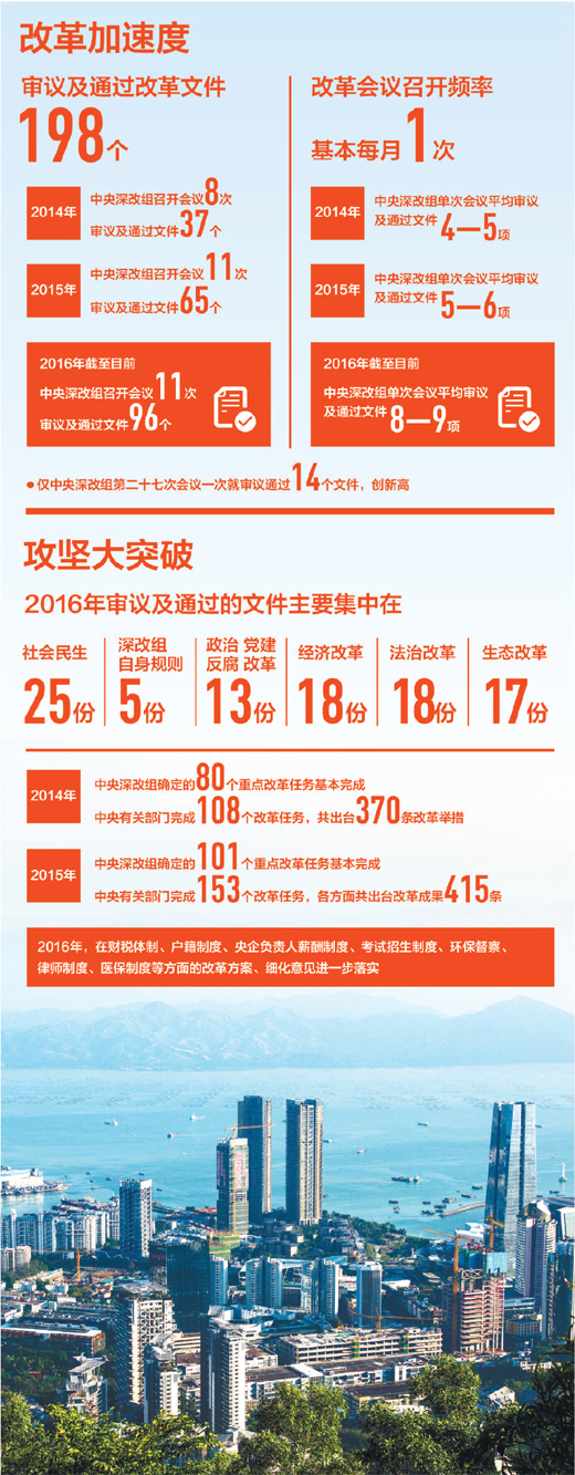 “如果把全面深化改革比作建造大厦的话,这三年是夯基垒台、选材备料、立柱架梁的三年,今年力争把主体框架搭建起来。”2016年,全面深化改革的“四梁八柱”拔地而起。