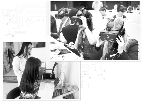 右上图 VR、AR、人工智能等新技术成为互联网产业的新风口,图为外国用户体验天猫VR购物。