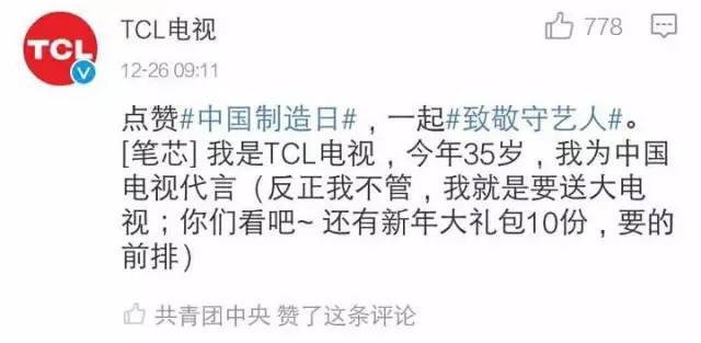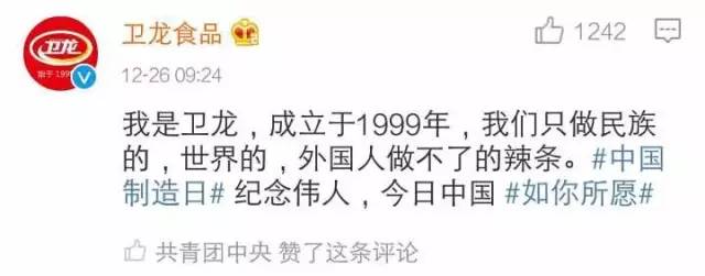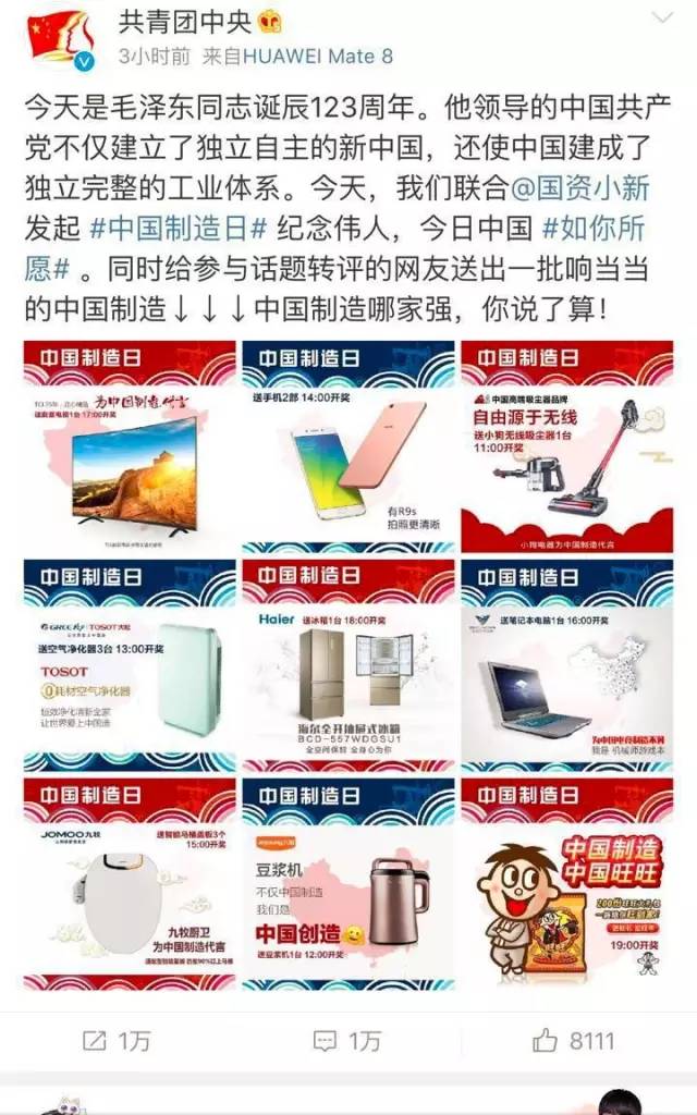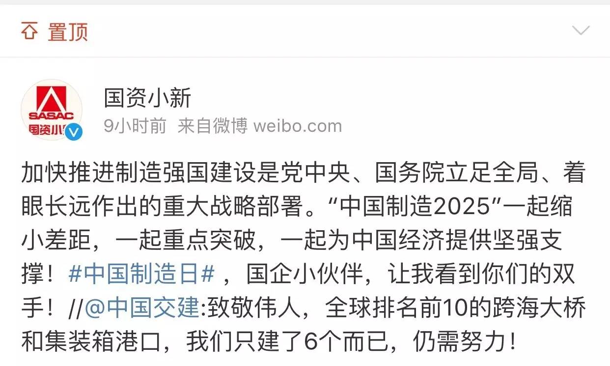 刚刚结束的推进“中国制造2025”工作会暨国家制造强国建设领导小组第四次会议上指出,加快推进制造强国建设是党中央、国务院立足全局、着眼长远做出的重大战略部署。在毛泽东同志诞辰123周年的今天,@共青团中央 和@国资小新 共同发起#中国制造日#话题。集中展示国有企业和中国制造所取得的巨大进步,为全面实施“中国制造2025”,深化创新驱动贡献力量。让我们共同努力,一起缩小差距,一起重点突破,一起为中国经济提供坚强支撑!