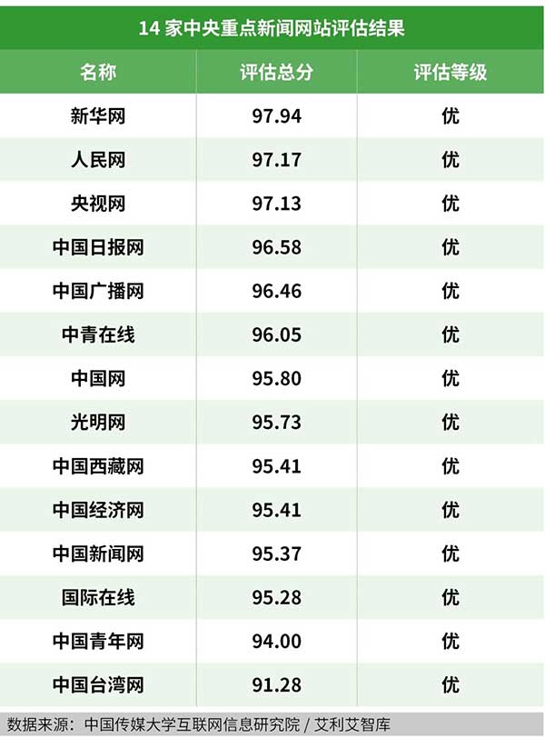 12月,网站信息生态整体表现良好。14家中央重点新闻网站平均总分为95.68分,网站信息生态状况整体表现为优。新华网、人民网、央视网位列本期评估前三甲,在信息生产传播与创新能力、内容安全保障等多方面能力较强。评估总分情况如下: