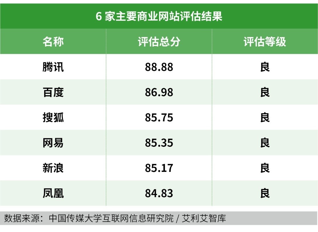 6家主要商业网站平均总分为86.16分,网站信息生态总体表现为良。腾讯、百度、搜狐凭借高响应度以及内容安全保障能力表现较好,优于其他商业网站。评估总分情况如下: