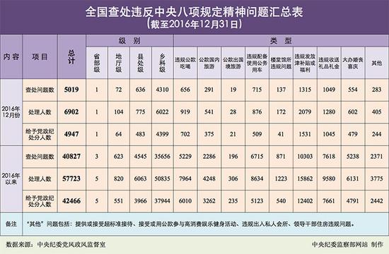 2016年以来,截至12月31日,全国查处违反中央八项规定精神问题情况如下: