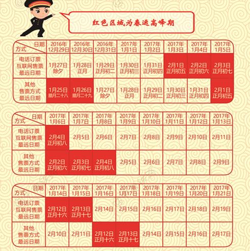 中新网北京1月4日电(记者 李金磊)春运迎来返程购票高峰期。自今日起,通过网络和电话就可以购买春节假期最后一天,也就是正月初六(2017年2月2日)的火车票了。需要注意的是,多地铁路局临时加开部分旅客列车,没有抢到火车票的旅客可以关注下临客。