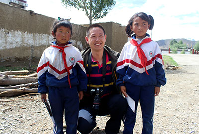 去日喀则偏远农村探访时,赵方印(中)给孩子发放完爱心款后,跟孩子们一起合影。