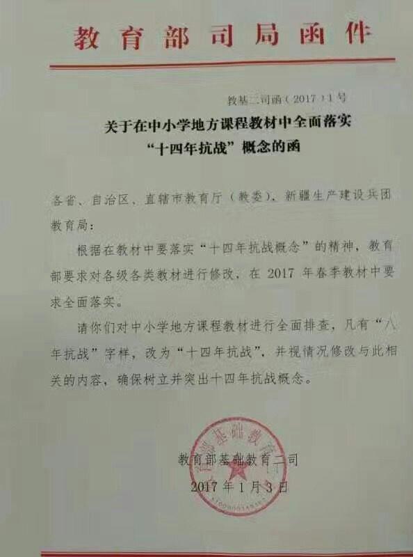 近日,教育部下发2017年1号函件《关于在中小学地方课程教材中全面落实“十四年抗战”概念的函》(以下称为《函件》)。1月10日,教育部基础二司向澎湃新闻(www.thepaper.cn)证实了该通知确实由他们所发。目前2017年春季教材已全面落实。
