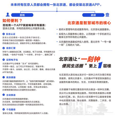 “北京通”会为每位经过实名认证的市民生成一张含有独一无二号码(北京通号)的电子身份证,办理所有的政务和公共服务事项就可畅通无阻了,办事获得的再也不是东奔西走的麻烦,而是一切顺利的幸福感。