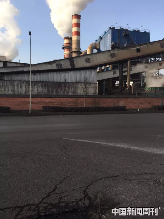 在7号厂区的红色院墙内,一栋三层楼高的生产车间紧挨着马路,像垒起的集装箱,银白色的墙皮已经老旧,蒙上黑色的粉尘。机器轰鸣震耳,却只能看到几个黑洞洞的窗户。车间楼下紧贴院墙处,四个巨大的罐体冒着白色的蒸汽,冷却的水滴如同小雨,斜斜地拍到路人的脸上,即使在15米宽的马路对面都无法避免。