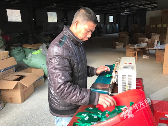 王明江在茶厂做包装茶叶的工作,如今一家人顺利脱贫。记者 祝可 摄