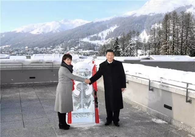 达沃斯演讲之前,瑞士联邦主席洛伊特哈德专程赶到习近平主席下榻的酒店同中国贵宾会面。酒店观景台上,一尊可爱的熊猫冰雕上插着中瑞两国国旗。洛伊特哈德向习近平主席赠送了一副印有“中瑞旅游年”字样的红色滑雪板。两国元首合影留念,开启中瑞旅游年的大幕。