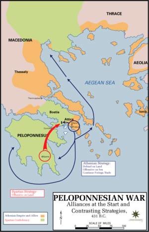 伯罗奔尼撒战争(Peloponnesian War),从公元前431年一直持续到公元前404年,是以雅典为首的提洛同盟与以斯巴达为首的伯罗奔尼撒联盟之间的一场战争。
