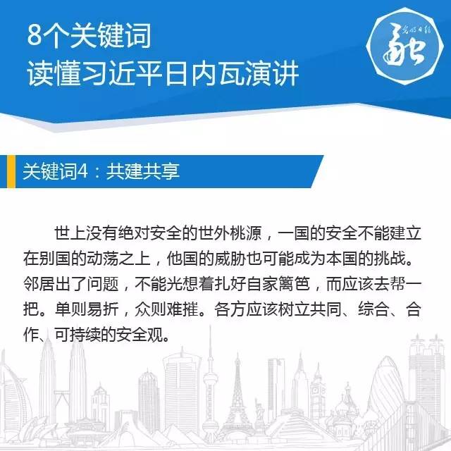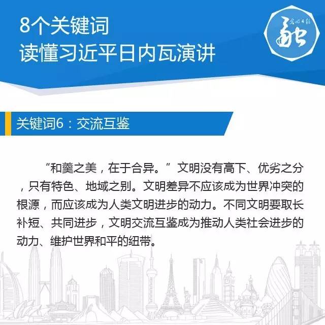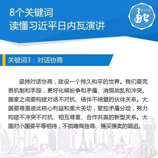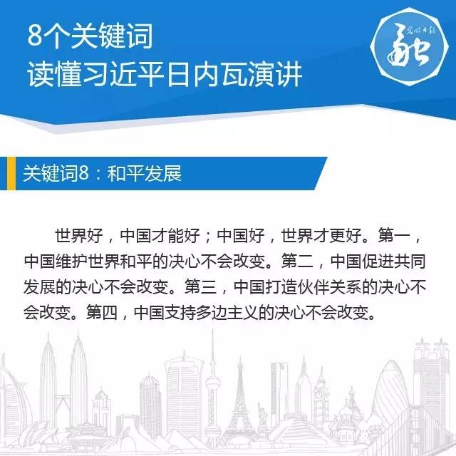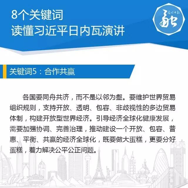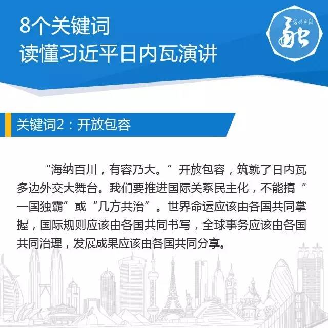 1月18日,国家主席习近平在瑞士日内瓦万国宫出席“共商共筑人类命运共同体”高级别会议,并发表题为《共同构建人类命运共同体》的主旨演讲。习近平在演讲中提到:“对中国来讲,日内瓦具有一份特殊的记忆和情感。1954年,周恩来总理率团出席日内瓦会议,同苏联、美国、英国、法国等共同讨论政治解决朝鲜问题和印度支那停战问题,展现和平精神,为世界和平贡献了中国智慧。”今天,小编带你用8个关键词,读懂习近平日内瓦演讲。