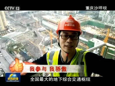 现在在我身后的巨大工地就是正在施工建设的全国最大的地下综合交通枢纽——沙坪坝枢纽工程的施工现场。它有高铁站、地铁站等于一体,地下建筑八层,接近40米深,高峰时期有将近1500名建设者参与该工程的施工与建设。工程建成后,人们从重庆到成都乘高铁只需要58分钟。