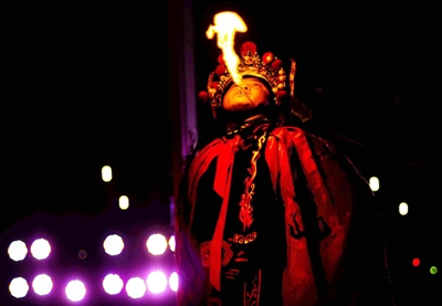 大年初四晚,昌坊村大型民俗灯会展出期间,主办方邀请专业演员为游客表演川剧艺术中的“变脸”和“喷火”绝活,赢得在场观众阵阵掌声。
