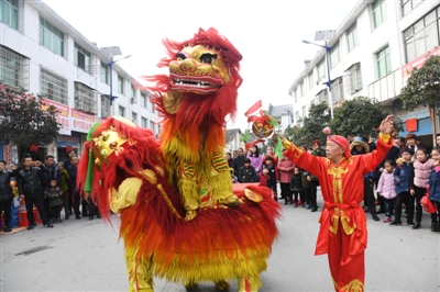 大年初四,渝水区界水乡举行舞龙灯、舞狮子等传统民俗活动,庆祝新春佳节。明媚阳光下,两只威武的狮子辗转腾挪,登高翻滚,穿插跳跃,引得围观群众阵阵喝彩。自明清时期以来,当地就一直传承着舞龙舞狮过大年的传统。