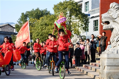 春节期间,仙女湖区欧里镇白梅村的孩子们用独轮车表演舞龙等节目,为村民们送上新春祝福。