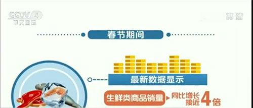 电商平台的数据显示,春节期间生鲜类商品热销,同比增长接近4倍,进口生鲜销量更是同比增长超过14倍。