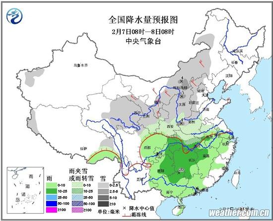 今天,此轮降水将大幅扩张,范围和强度都将达到最大,覆盖面积约为330平方公里。中央气象台预计,2月7日至8日夜间,我国中东部地区将出现大范围雨雪天气。西北地区中东部、华北大部将有小到中雪,陕西关中、江汉中北部、江淮北部等地有雨夹雪或雨夹雪转雪,其中,内蒙古中部等地局地有大雪;西南地区东部、江淮南部、江南和华南等地有小到中雨。