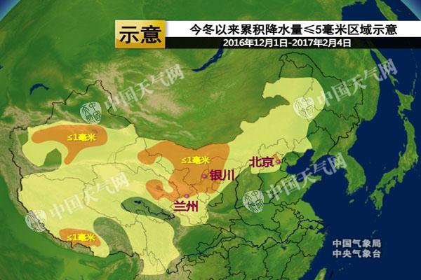 2016年12月以来,北方地区的内蒙古、华北北部、西北等地普遍“贫雪”。据统计,截至今年2月4日上述地区累积降水量普遍不足5毫米,特别是内蒙古西部、宁夏中北部、甘肃中部等地,累积降水量甚至不足1毫米。此轮降水虽然强度不大,但可算得上“久旱逢甘霖”了。