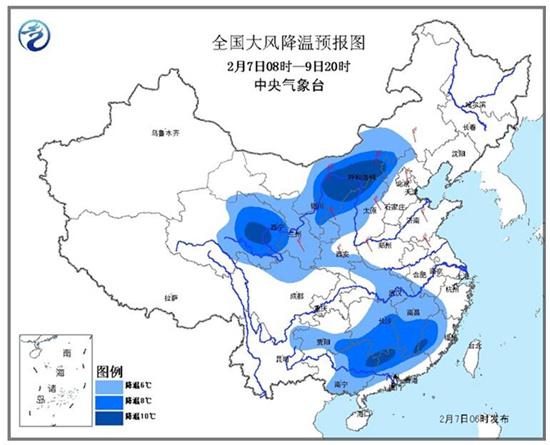 今天冷空气将强势发威,横扫中东部,气温普降4~8℃。中央气象台预计,受冷空气影响,7日至9日,我国中东部大部地区自北向南将出现大范围大风降温,平均气温将普遍下降4℃以上,其中,青海东部、陕西北部、内蒙古中部、山西北部、贵州东南部、湖南中南部、江西中南部、福建西部、广西北部和广东北部等地气温将下降8℃以上,局地超过10℃。长江以北地区并伴有4~6级偏北风,东部和南部海区风力有7~9级。中央气象台2月7日06时继续发布寒潮蓝色预警。