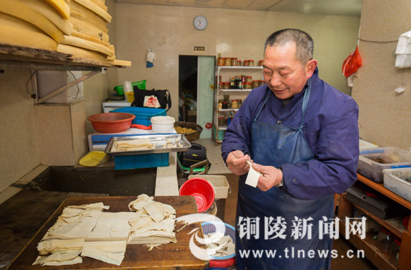 2月4日,农历大年初八,在铜陵大通镇澜溪老街的二周豆腐坊,店主周美桃正在往木制的模子里一层一层灌倒豆浆,为制作千张皮和豆腐干忙碌着。