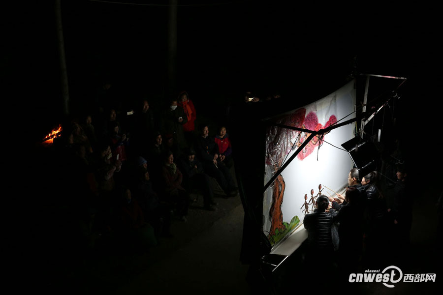 西部网讯(记者 魏永贤)渭南市华州区樱桃沟村,夜幕降临,村里的老乡们汇聚到皮影戏台前观看皮影戏,冬夜室外寒冷,老乡们的身后生起了火御寒。“你看,喜儿的芭蕾跳得多好呀,比真人都好。”一名年轻的媳妇兴奋地说。