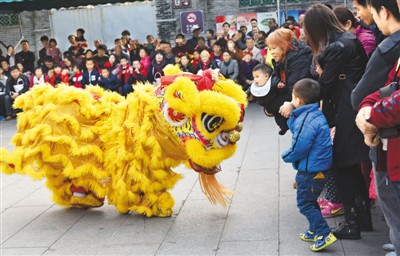 2月9日,在广东省佛山市禅城区祖庙内的黄飞鸿纪念馆,醒狮团队为前来观光的游客献上精彩的舞狮表演,带来新春祝福,喜迎元宵佳节。图为醒狮表演者在现场与游客互动。
