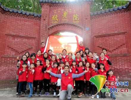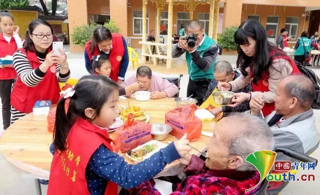 刘天明带领小榄中小学学生给敬老院老人们喂饭、敬老。本人供图