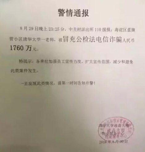 据了解,2016年7月,54岁的北京清华大学黄姓女教授遭假冒的大陆检察院人士以微信实施诈骗,共被骗走人民币1800多万元。