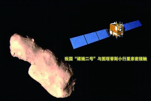 2012年12月13日,中国第二颗月球探测器嫦娥二号圆满完成探月既定任务和日-地L2点试验任务之后,在距地球约700万千米远的深空,以每秒10千米的相对速度,从图塔蒂斯小行星身边飞奔而过,距“战神”最近的距离约为770米。