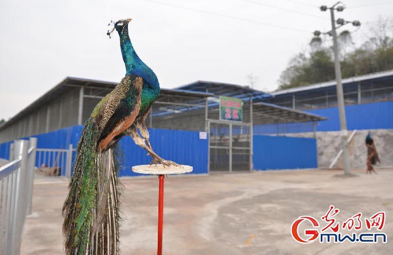 “这里的孔雀一般一年就可以出售,每只孔雀的价格是800元。两年以上的孔雀主要是出售孔雀羽毛或制成工艺品。”周天森向光明网记者介绍,每根孔雀羽毛可以卖五十元,而制成的孔雀标本则可以卖到一万五千元。