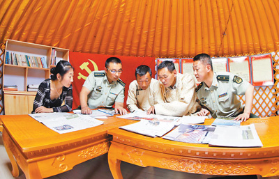 图为边防民警和牧民在“党员中心户”学习党的惠牧政策。资料照片
