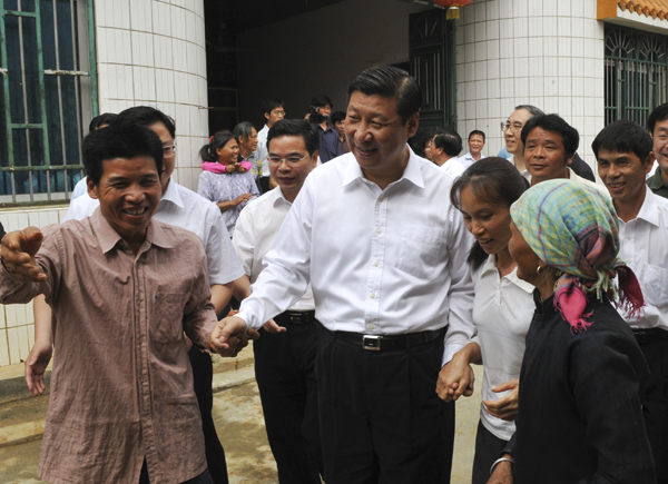2010年5月10日,习近平在广西省百色市田阳县新立村共联屯马正规(左一)家与村民一起拉家常,详细了解村民的生产生活情况。