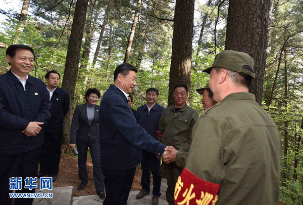 2016年5月23日至25日,中共中央总书记、国家主席、中央军委主席习近平在黑龙江考察调研。这是5月23日下午,习近平在上甘岭林业局溪水国家森林公园视察时,叮嘱林场工作人员一定要把森林资源保护好。新华社记者李涛摄