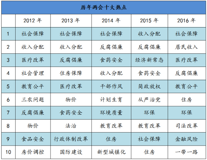 纵观近五年来的两会话题关注度,百姓对涉及政治、经济、文化、社会等领域的传统热点新闻信息较为关注,其中社会保障、收入分配、反腐倡廉等是历年来受到百姓持续关注的热点话题。其次,由于近年来,我国在诸多领域都进行了较大程度的改革,因此对于新制度、新改革的成绩及进一步的改革措施也成为百姓较为关注的热点话题。历年两会热点排行如下: