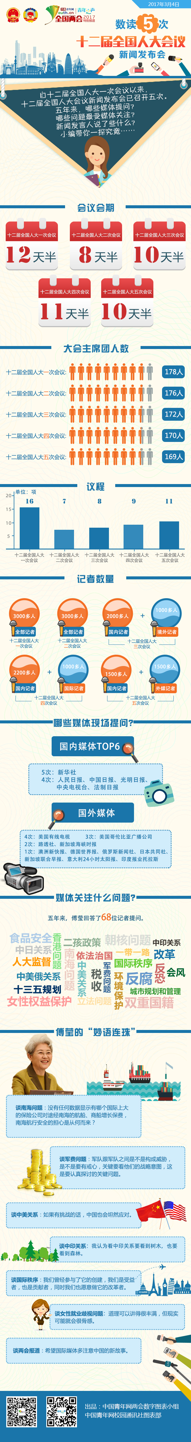 中国青年网北京3月4日电自十二届全国人大一次会议以来,十二届全国人大会议新闻发布会已召开五次。五年来,哪些媒体提问?哪些问题最受媒体关注?新闻发言人说了些什么?小编带你一探究竟……