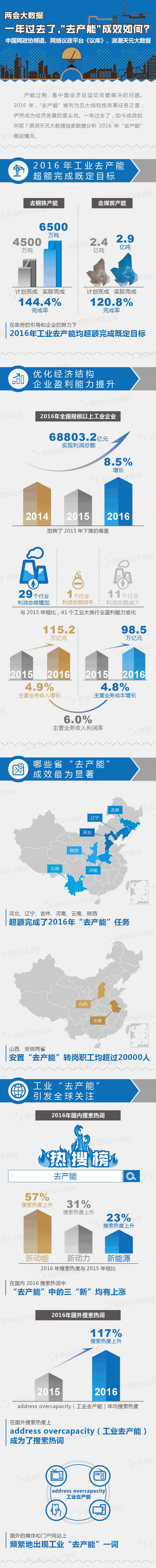 在政府的引导和企业的努力下,2016年工业去产能完成情况喜人——2016年计划去钢铁产能4500万吨,实际完成6500万吨,完成率144.4%;计划去煤炭产能2.4亿吨,实际完成2.9亿吨,完成率120.8%,均超额完成既定目标。
