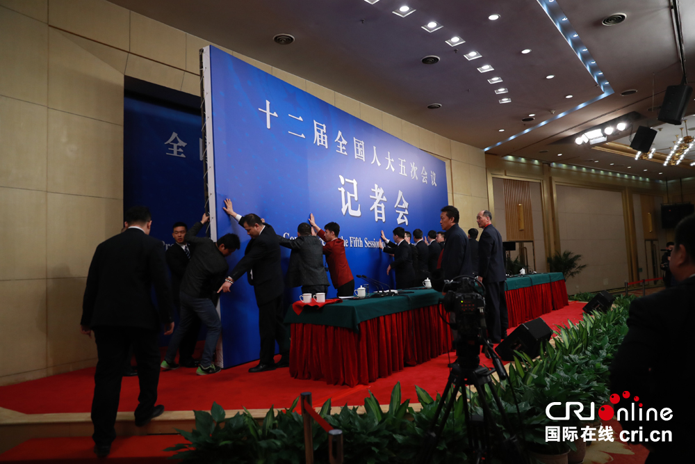 国际在线消息(记者 沈湜):2017年3月7日上午,十二届全国人大五次会议新闻中心在梅地亚中心多功能厅举行记者会,在上午的全国人大记者会结束后,新闻中心的工作人员马上为下午举行的全国政协新闻发布会更换背景板。