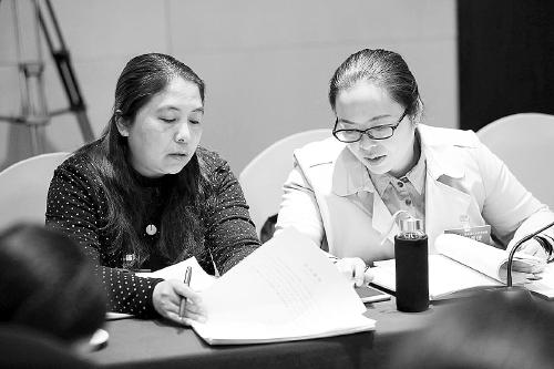 资艳萍代表(左)与邓瑞代表查看会议资料。本报记者张哲/摄