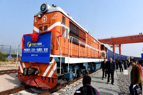2014年11月18日,“中欧班列(义乌-马德里)”首班从义乌铁路西站启程,全程13052公里,运行时间约21天。图片来源:人民网