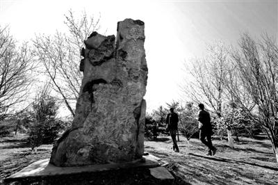 昨天下午,北青报记者来到门头沟区永定镇,道路两侧是大面积树林,沿途的桃树已经绽放出粉色、白色的花朵,在其他光秃秃的枝干的映衬下显得格外醒目。可以看出,部分树苗是栽植不久的,细细的树干上涂着半截白。在一处当地人称为“冯村沟”的地方,顺着一条不起眼的林间土路往里走,穿过几排桃树,眼前闪现出一块高大的石碑,上写“共和国部长纪念林”八个大字,落款是“二〇〇七年三月”。