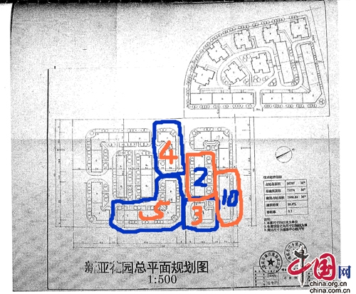 图片说明:新亚花园总平面规划图中,蓝色划线内为3号、4号、5号楼。红色划线内为2号、10号楼