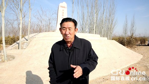 人大代表、治沙英雄、全国劳模王有德在Tata木门公益林碑前 摄影高翰伦