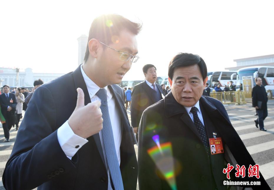 3月15日,十二届全国人大五次会议在北京人民大会堂闭幕,马化腾代表(左)和范立新代表步入会场。
