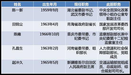 从中央到地方任职的5人中,4人为“60后”,2人为“65后”。其中,最年轻的是重庆市委常委、纪委书记陈雍,51岁,此前担任监察部副部长。