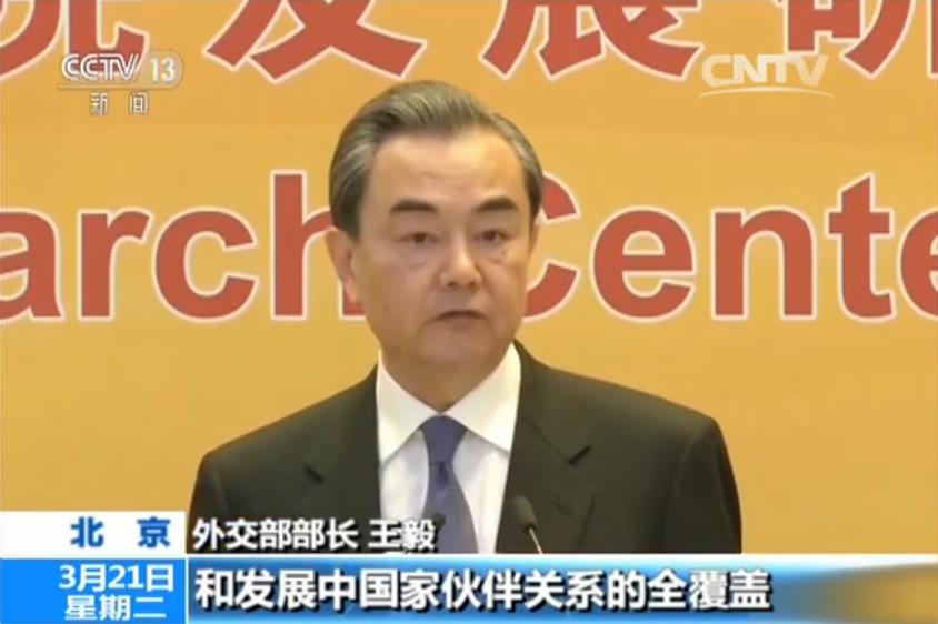 外交部部长王毅:中国这些年积极致力于同各国发展和深化伙伴关系,我们的朋友圈不断地扩大,截止到去年底,中国已经同97个国家或者国际组织建立了不同形式的伙伴关系,实现了对大国周边和发展中国家伙伴关系的全覆盖,伙伴关系已经成为中国外交一个重要的标志和一道亮丽的风景。