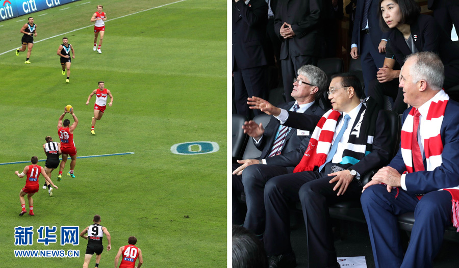 当地时间3月25日,国务院总理李克强在悉尼与澳大利亚总理特恩布尔共同观看澳式足球比赛(拼版照片)。 新华社记者 庞兴雷 摄