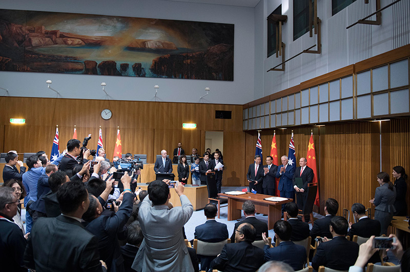 图为3月24日,国务院总理李克强与澳大利亚总理特恩布尔在堪培拉议会大厦,共同见证了中澳两国八份合作文件的签署,内容涉及中澳自贸协定、经贸投资、检验检疫、气候变化、农业、文化、教育等诸多领域。