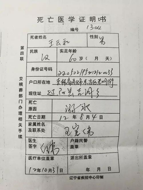 在赵连华提供的《死亡医学证明书》中,可以看到,死者王云和在2012年8月4日死于溺水,享年60岁。